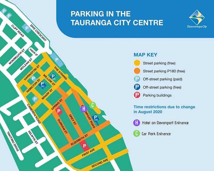 Alternatively, you may park on Devonport Road overnight at no charge. The free street parking is currently available from 3pm to 9am Monday to Friday and all weekend. The free parking hours are subject to change at any time, for up to date information please check with either our team or Tauranga City Council.